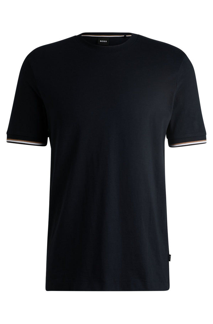 A short-sleeved T-shirt with signature-stripe cuffs by BOSS Menswear. Cut to a regular fit, this top is crafted in soft cotton jersey.