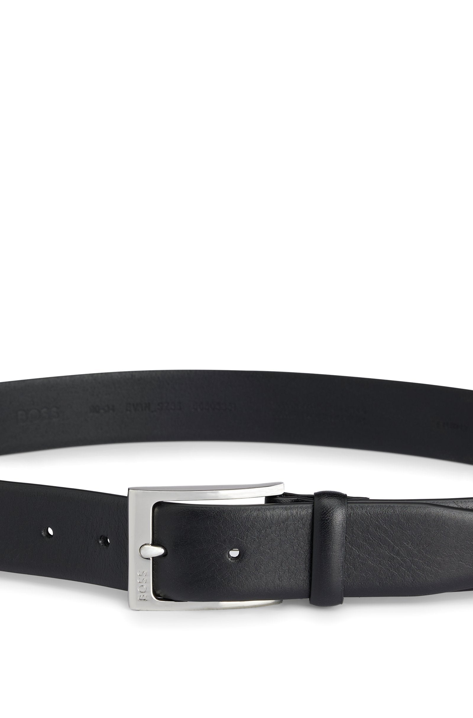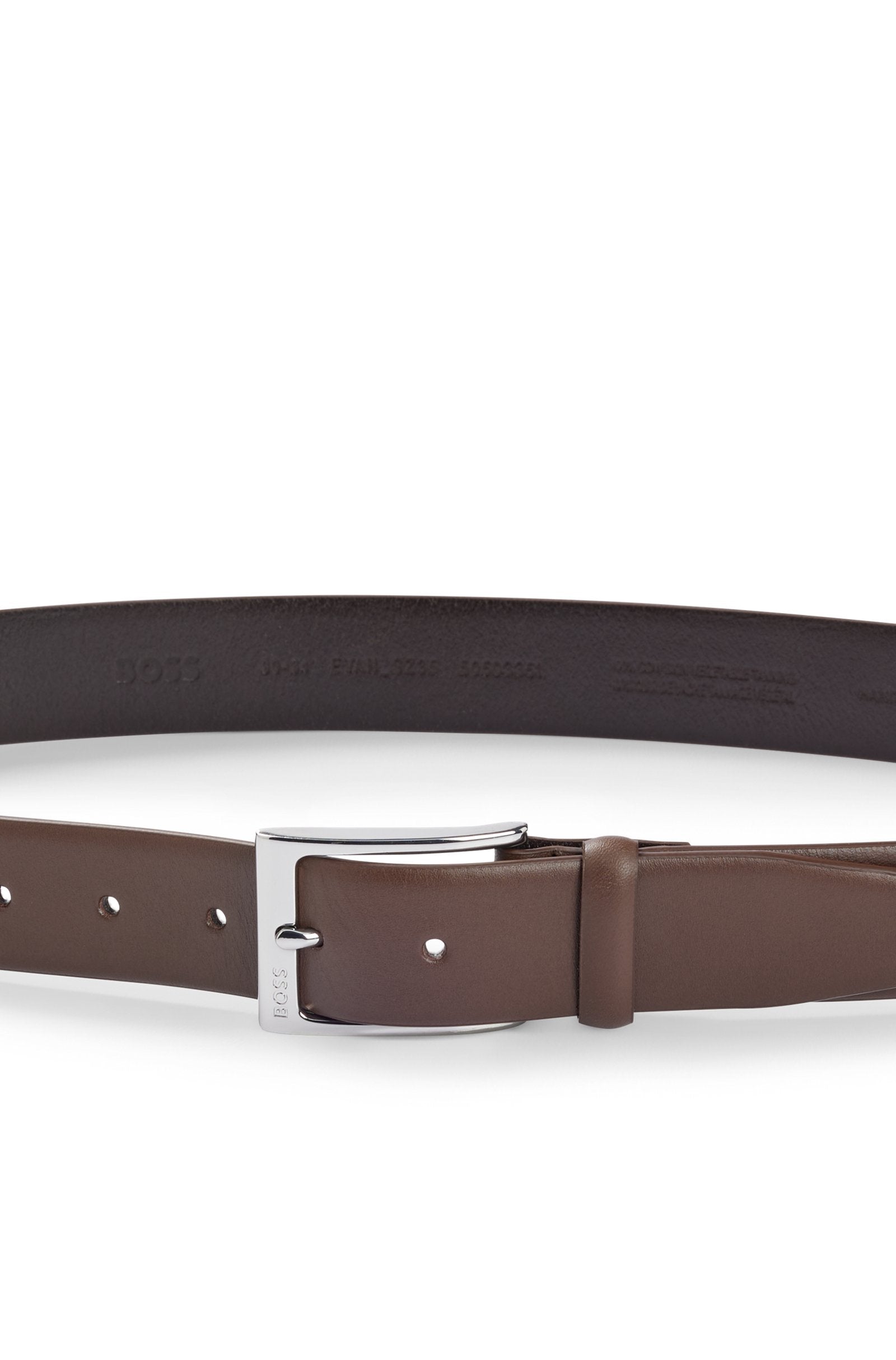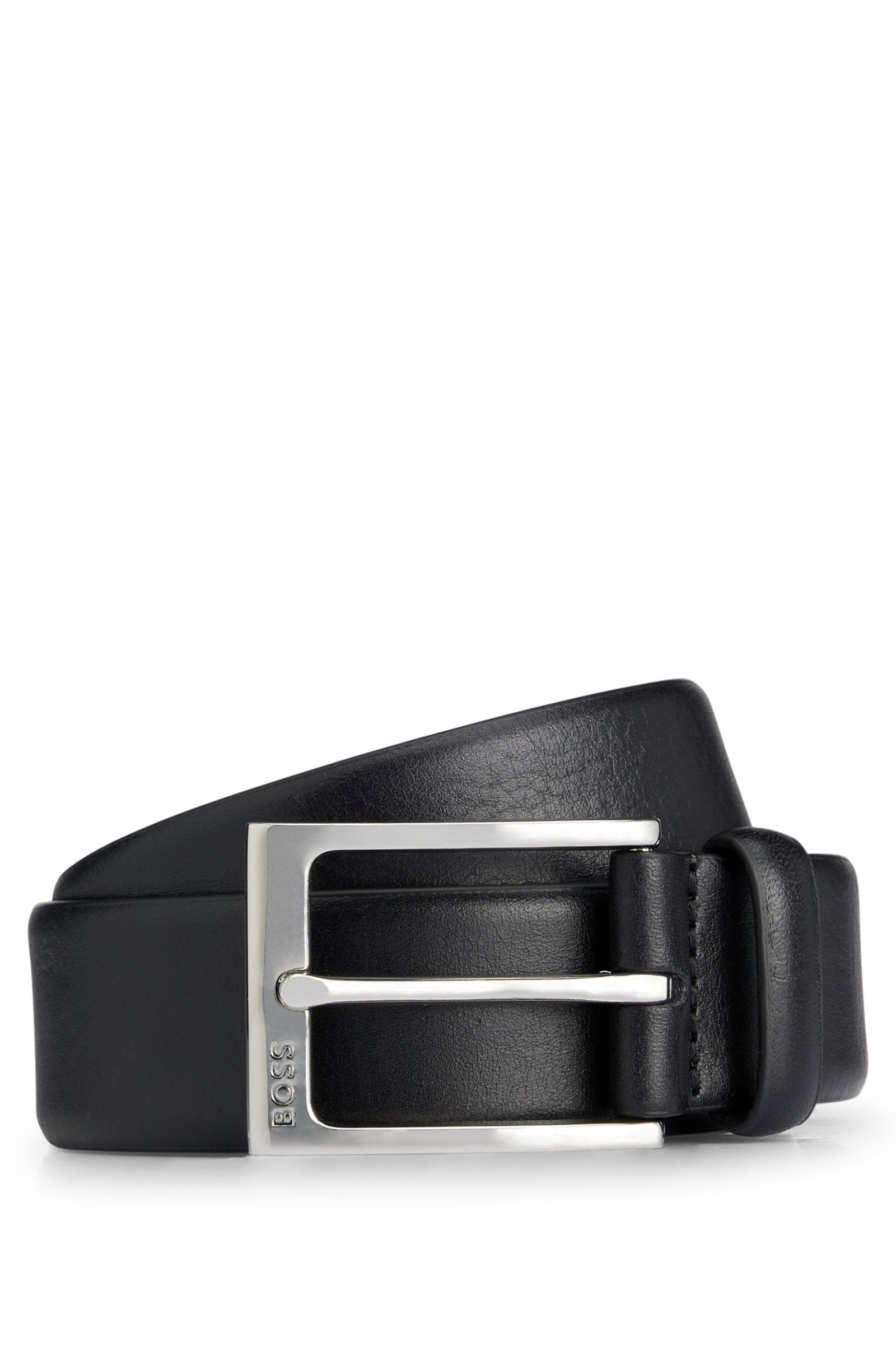 A 3.5cm belt in rich leather with a silver-tone pin buckle featuring an engraved logo by BOSS. For the best fit, we advise ordering a belt one size larger than your waist size.