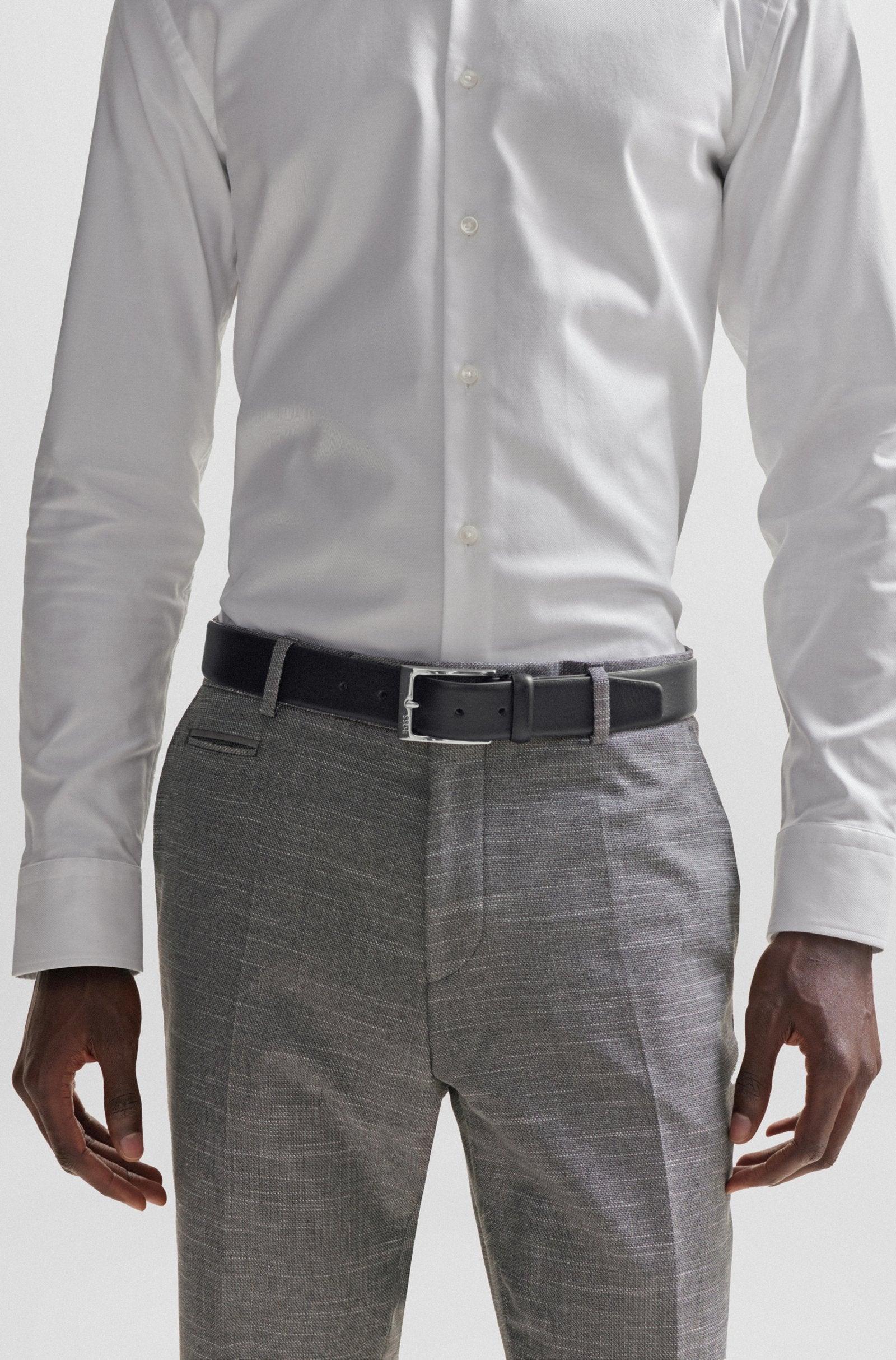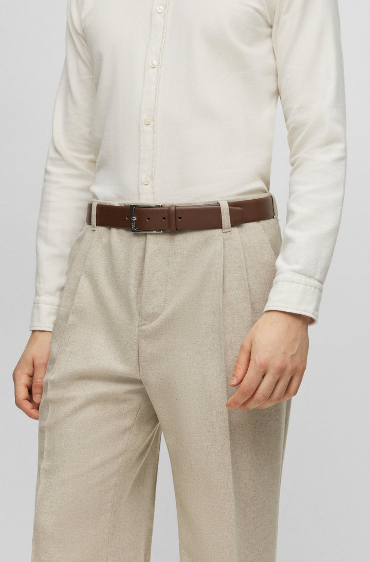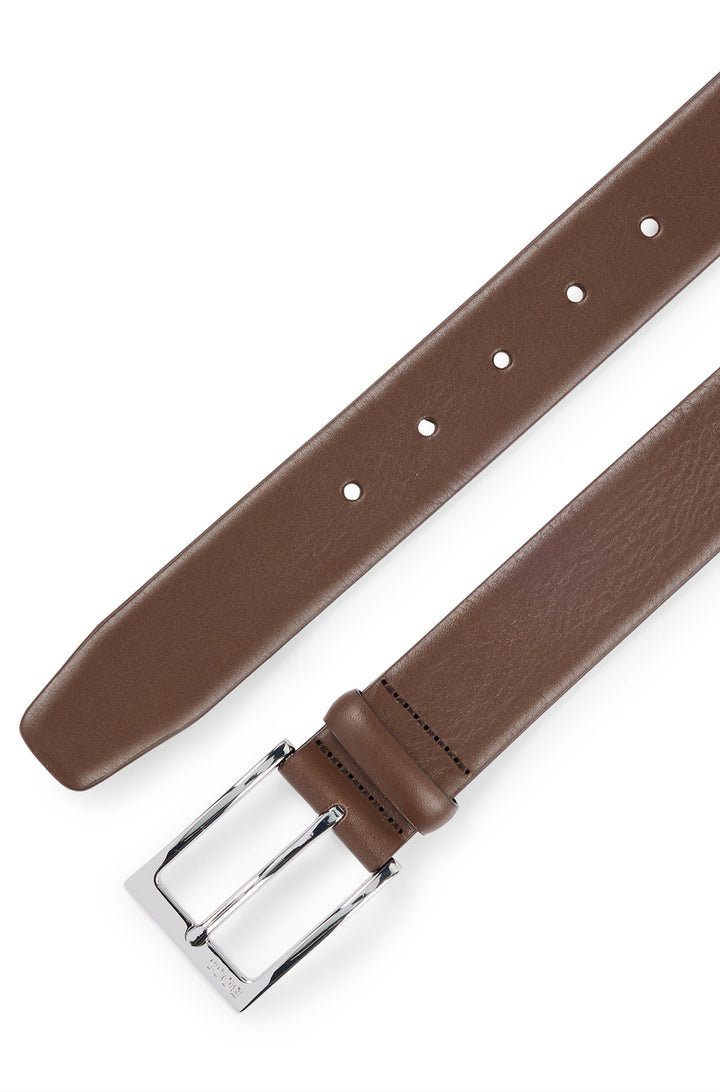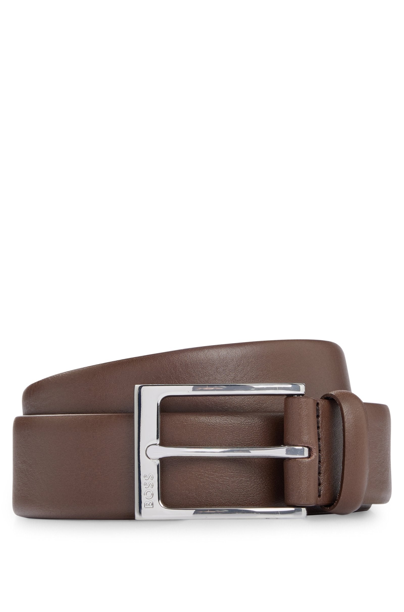 A 3.5cm belt in rich leather with a silver-tone pin buckle featuring an engraved logo by BOSS. For the best fit, we advise ordering a belt one size larger than your waist size.