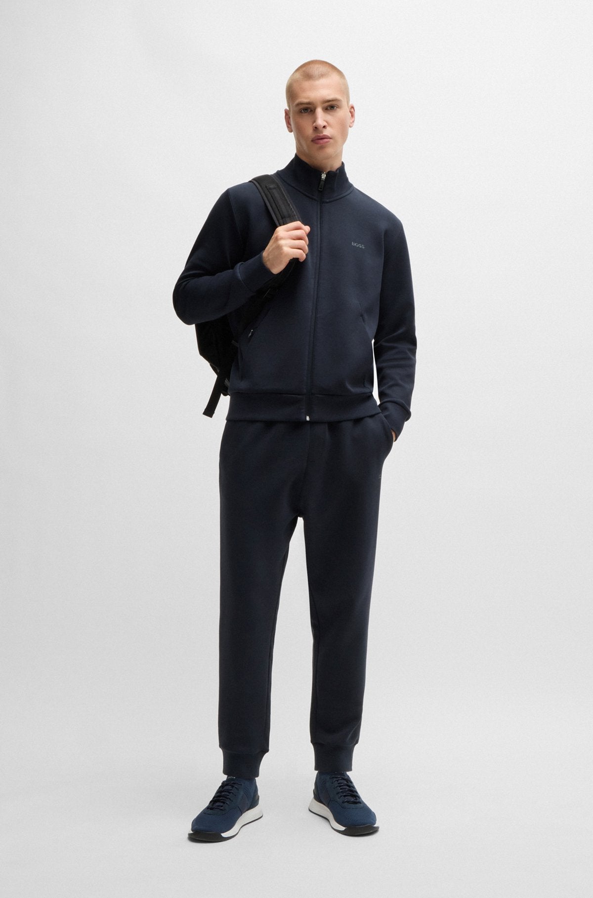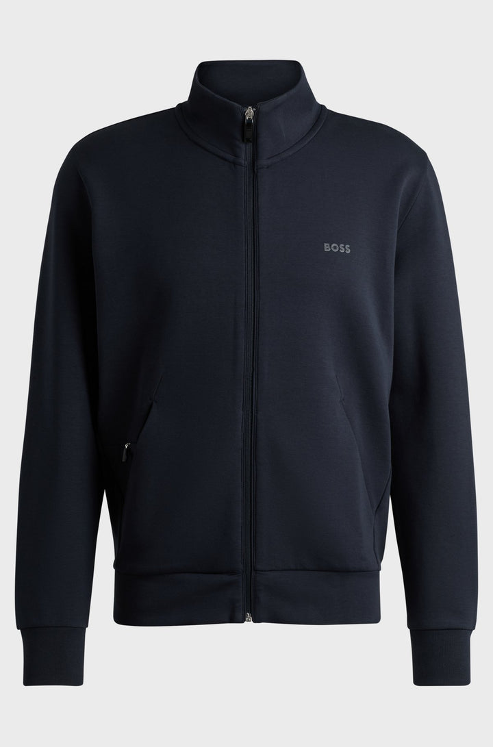 With its stretch-cotton construction and regular fit, this BOSS Menswear jacket makes an ideal sporty layer. Hidden zip pocket. Sandwich-print logo.